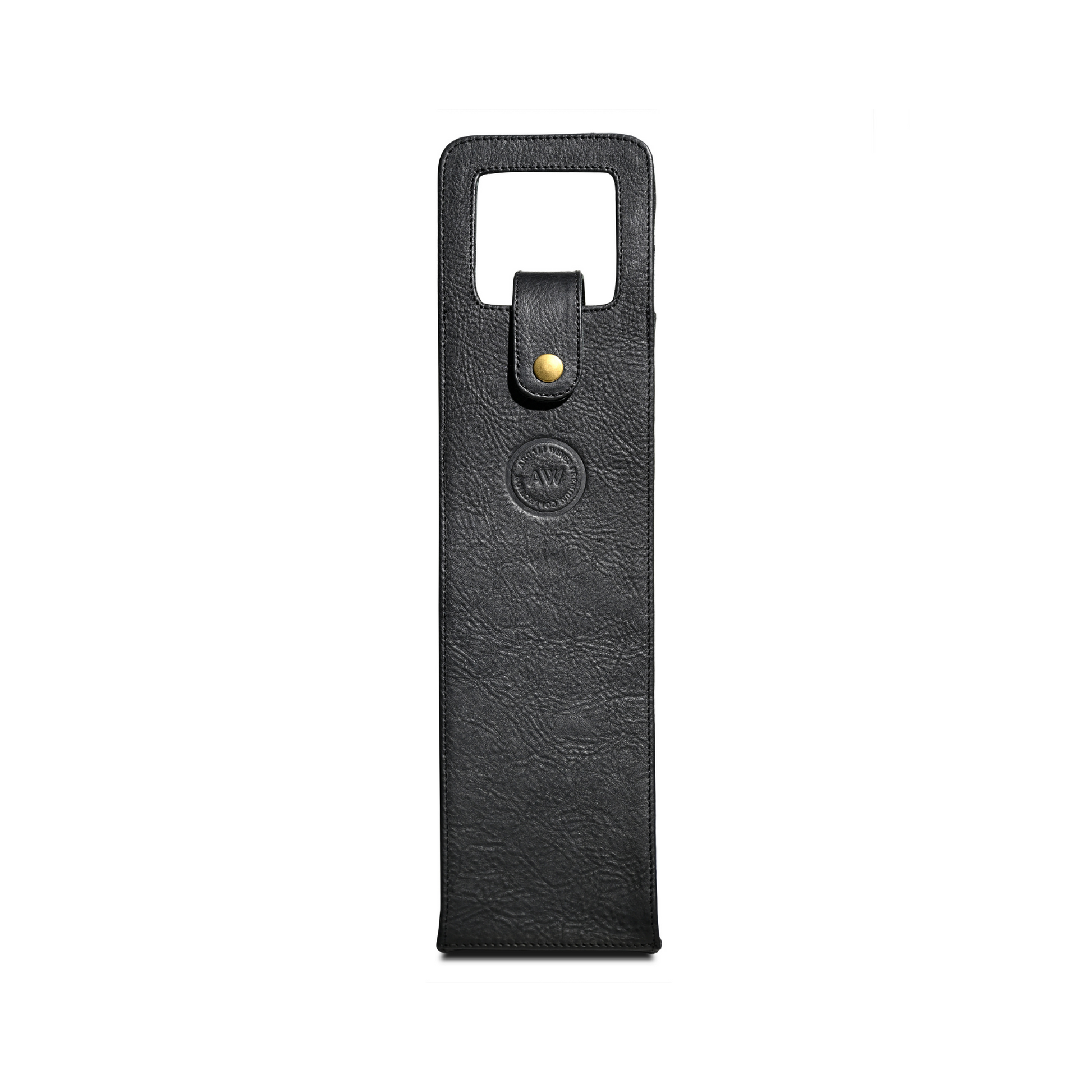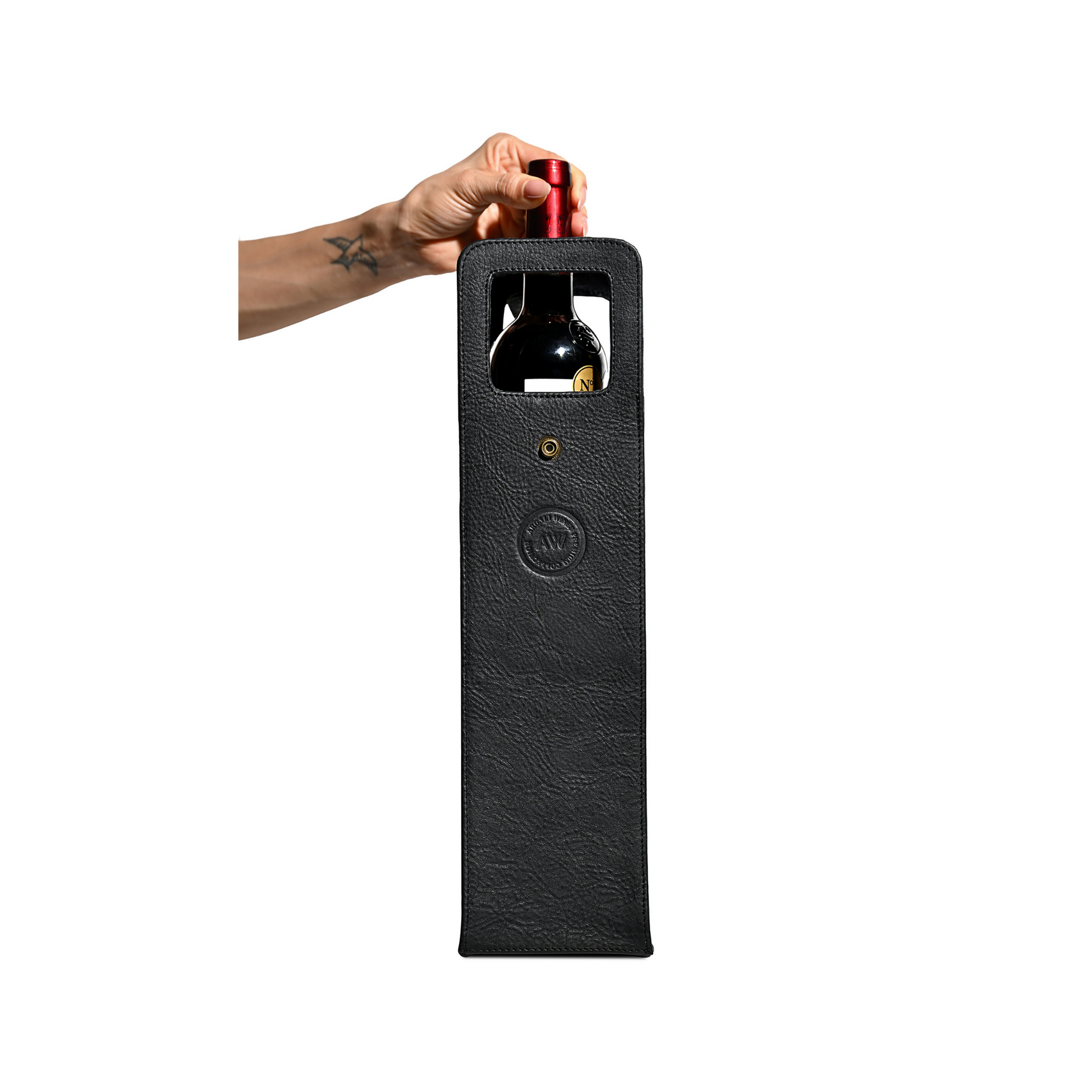 • Stylish leather tote for one bottle with a locking strap at the top to secure bottle in place.